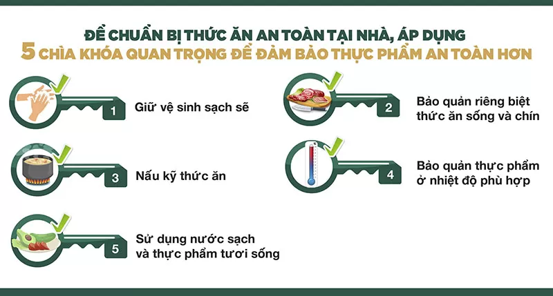 THỰC PHẨM AN TOÀN là yếu tố quan trọng giúp bảo vệ sức khỏe chúng ta. Để đảm bảo thực phẩm luôn an toàn từ khâu sản xuất đến tiêu thụ, Tổ chức Y tế Thế giới (WHO) đã đưa ra 5 chìa khóa quan mà mỗi người dân và cộng đồng cần lưu ý khi chế biến và tiêu thụ thực phẩm.
