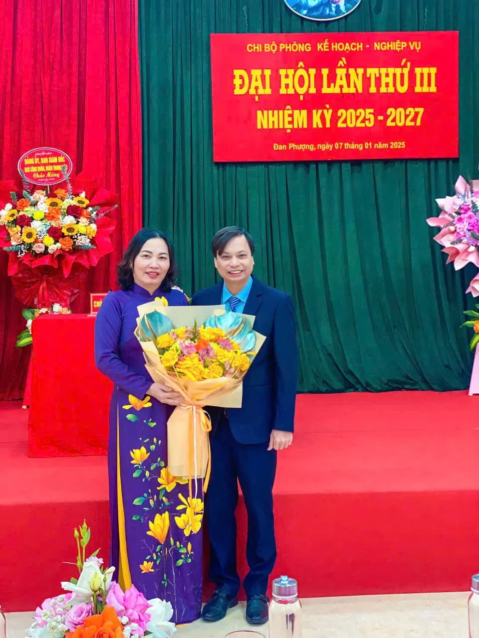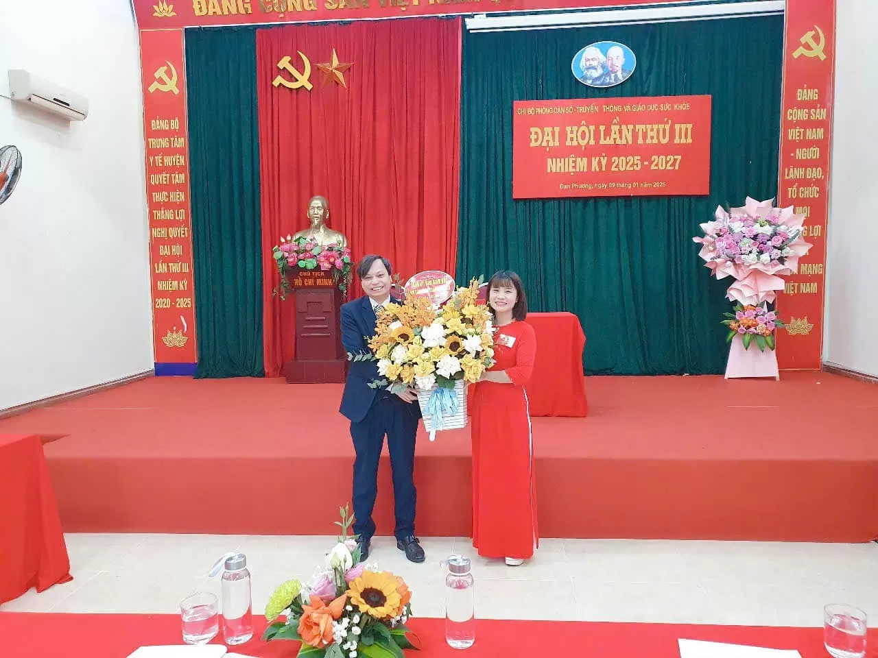 Đồng chí Nguyễn Gia Phúc, Phó Giám đốc Trung tâm Y tế huyện Đan Phượng tặng hoa chúc mừng Đại hội của Chi bộ Phòng Dân số - Truyền thông & GDSK