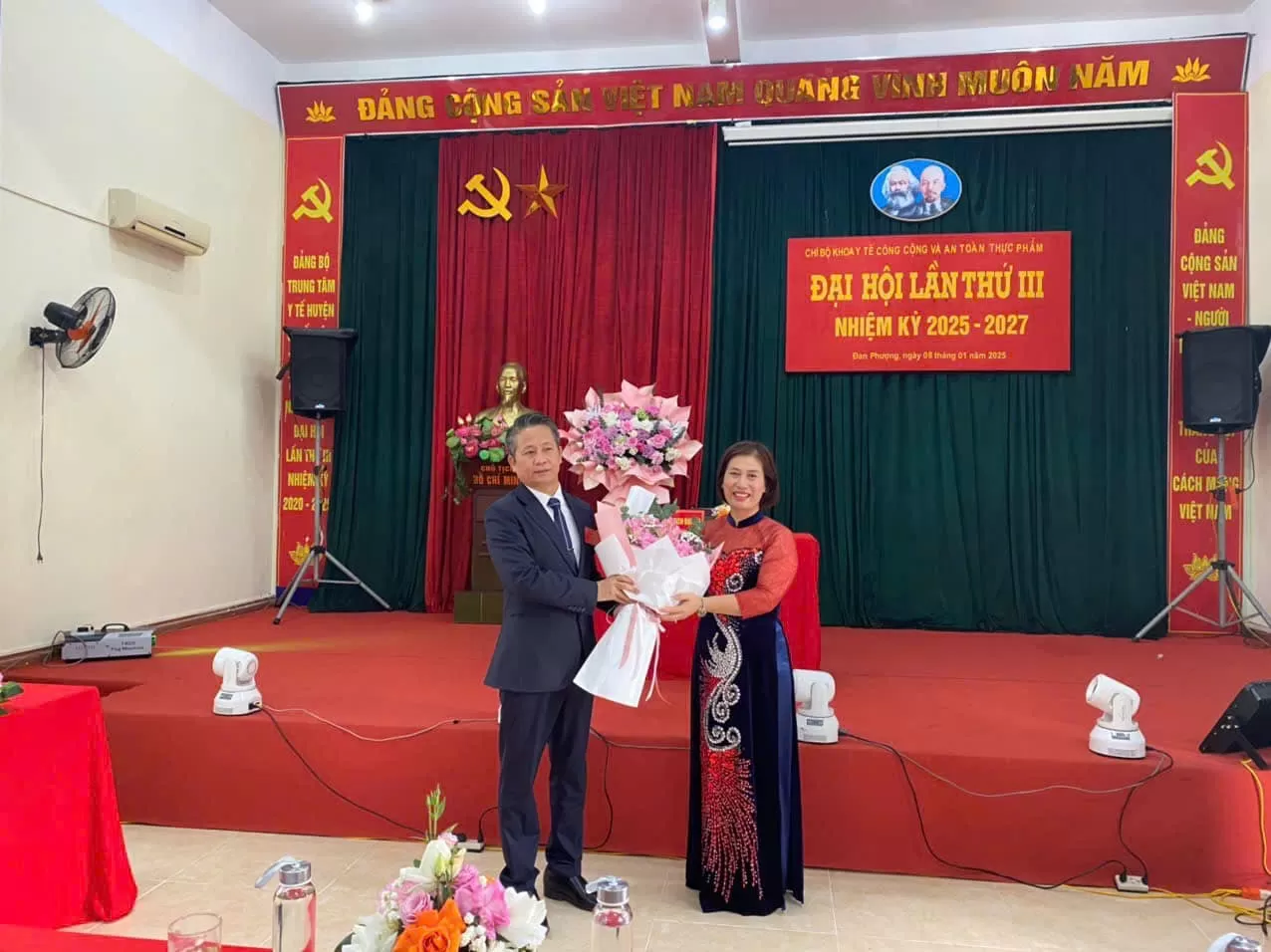 Đồng chí Nguyễn Thị Thu Trang, Giám đốc Trung tâm huyện Đan Phượng tặng hoa chúc mừng Đại hội Chi bộ Khoa Y tế công cộng & ATTP