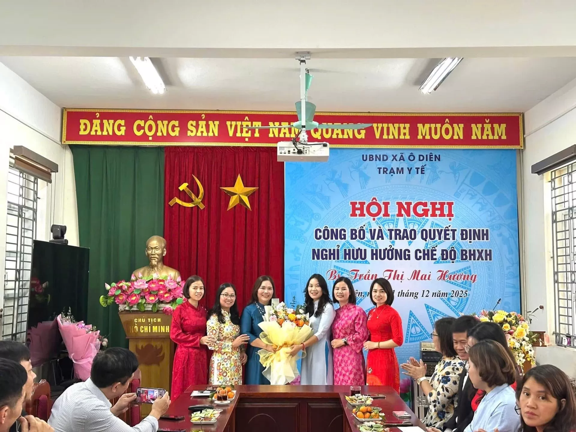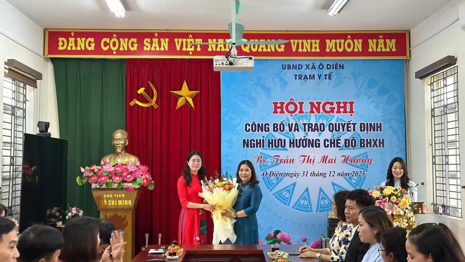 Sáng ngày 31/12/2025, Trạm Y tế xã Ô Diên đã long trọng tổ chức Hội nghị công bố và trao quyết định nghỉ hưu hưởng chế độ Bảo hiểm xã hội đối với bà Trần Thị Mai Hương – Phụ trách Điểm Y tế Tân Hội.