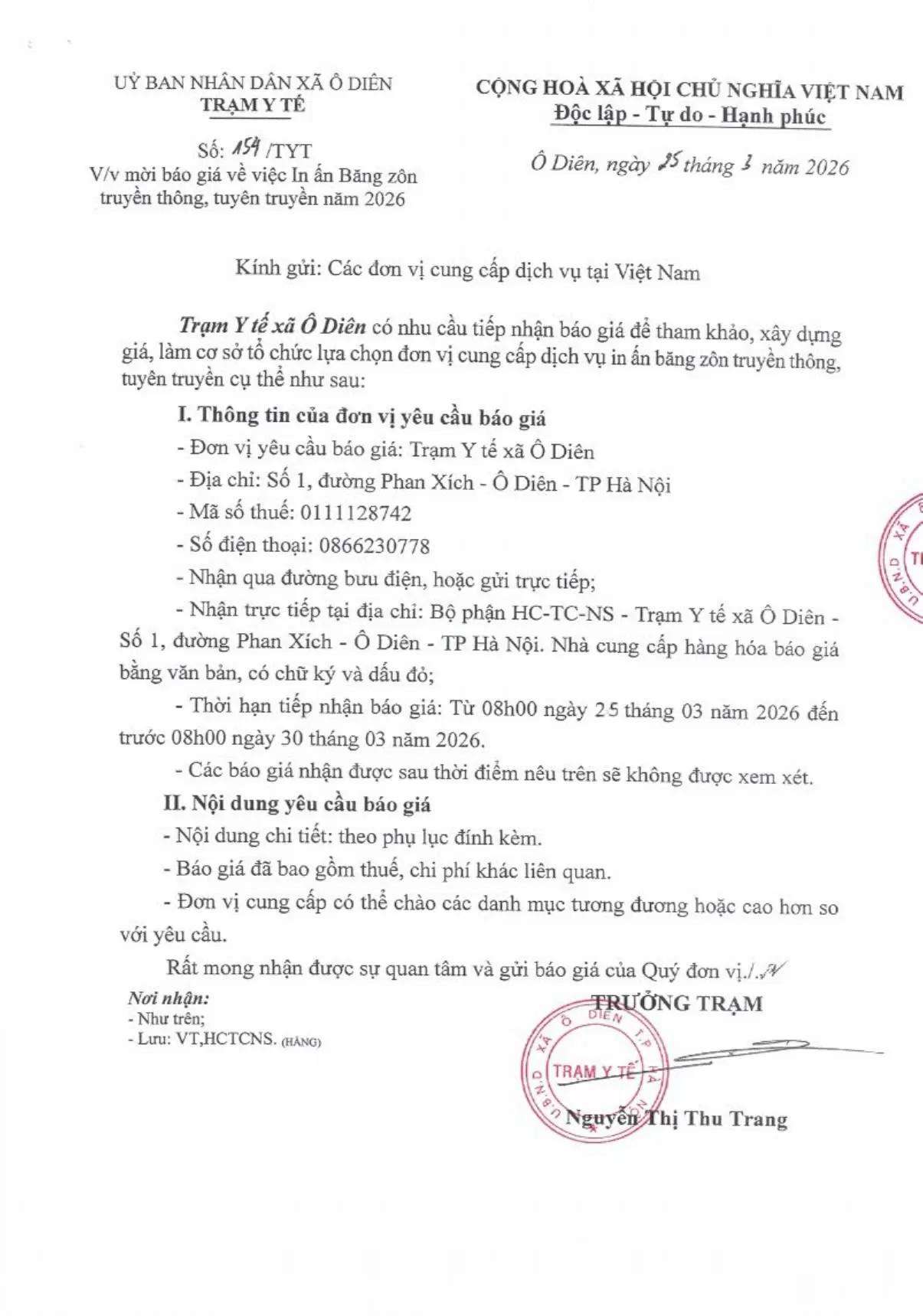 MỜI BÁO GIÁ MUA MÁY TÍNH ĐỂ BÀN, MÁY TÍNH XÁCH TAY CHO TRẠM Y TẾ XÃ Ô DIÊN NĂM 2026