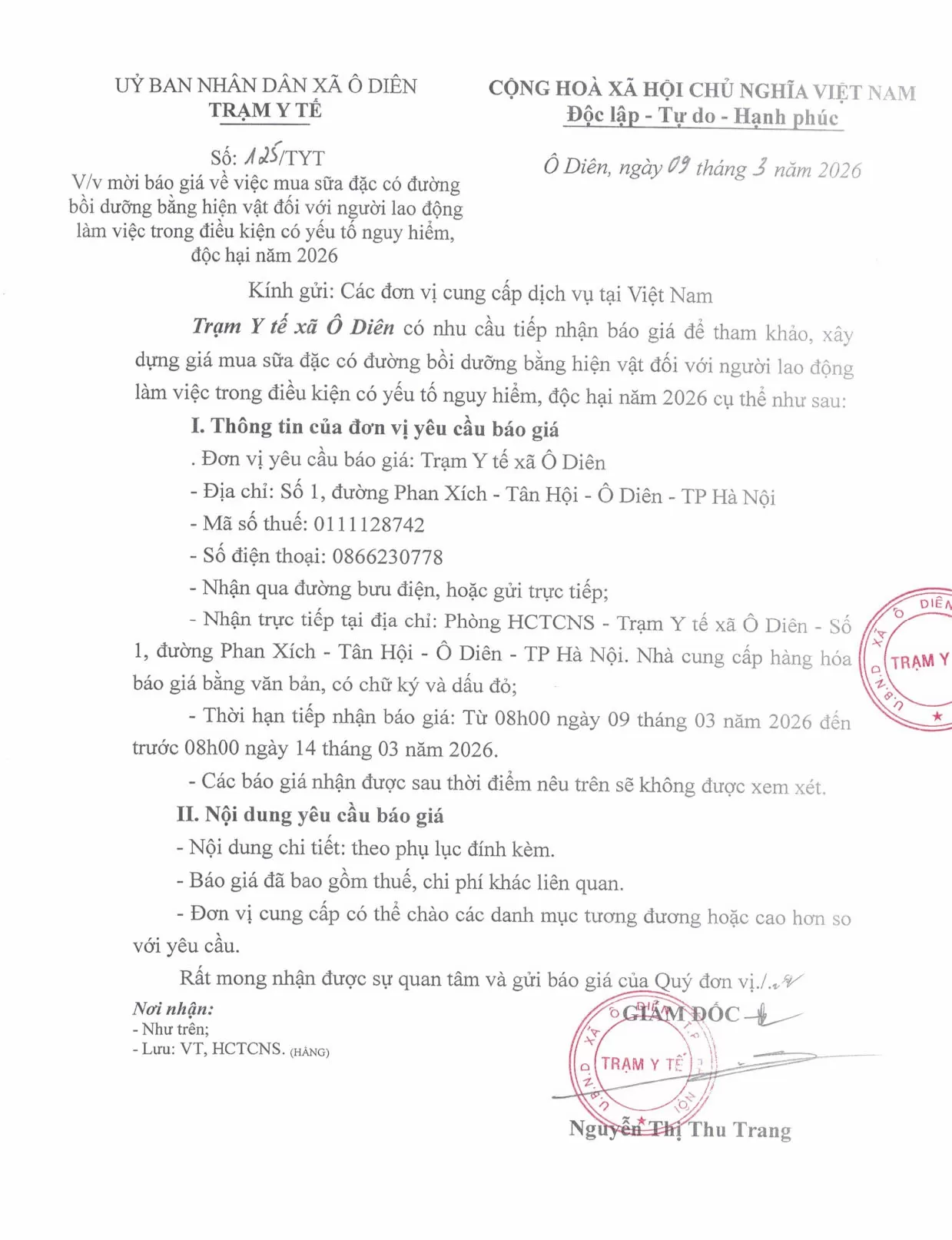 MỜI BÁO GIÁ VỀ VIỆC MUA SỮA ĐẶC CÓ ĐƯỜNG BỒI DƯỠNG BẰNG HIỆN VẬT ĐỐI VỚI NGƯỜI LAO ĐỘNG LÀM VIỆC TRONG ĐIỀU KIỆN CÓ YẾU TỐ NGUY HIỂM, ĐỘC HẠI NĂM 202610/03/2026 Chia sẻ: